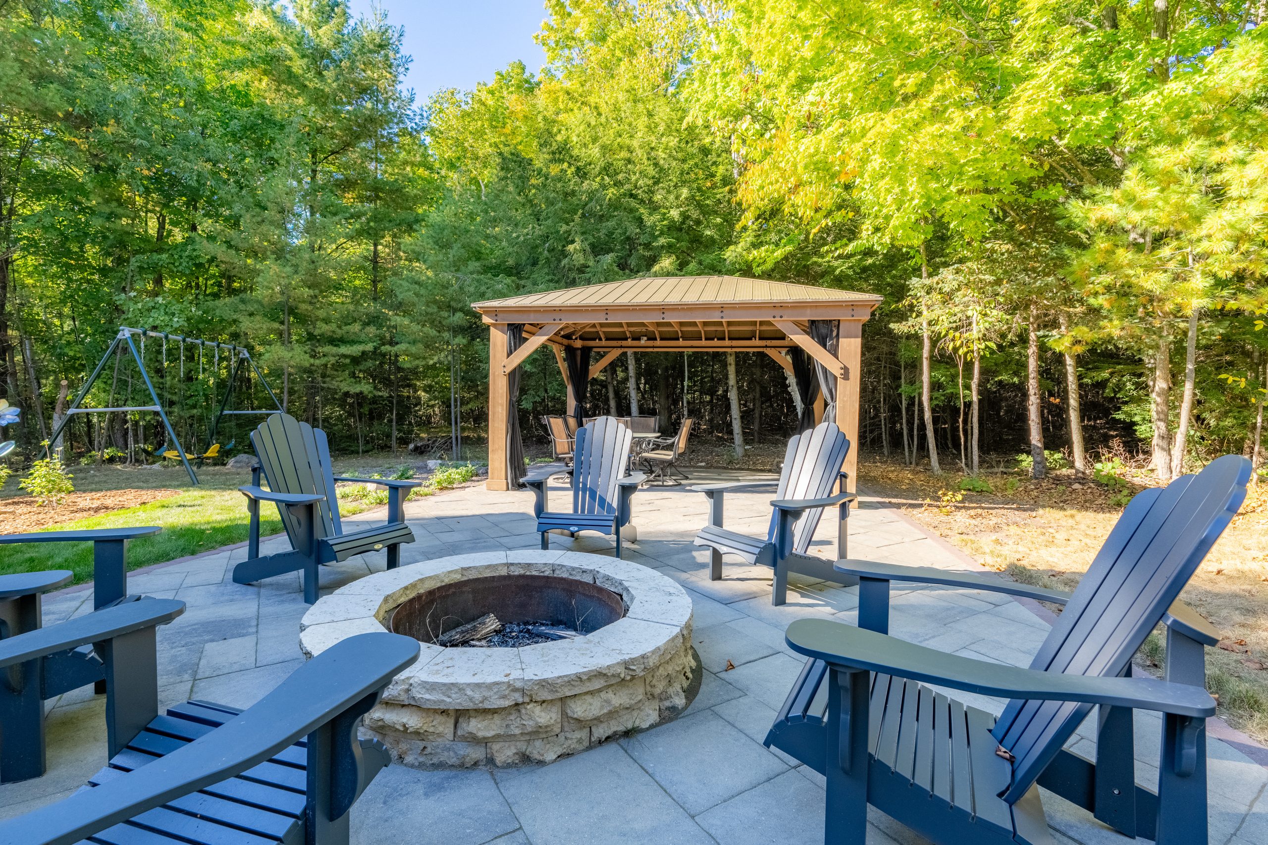 - Back yard terraced patio with retaining wall, fire pit, & gazebo